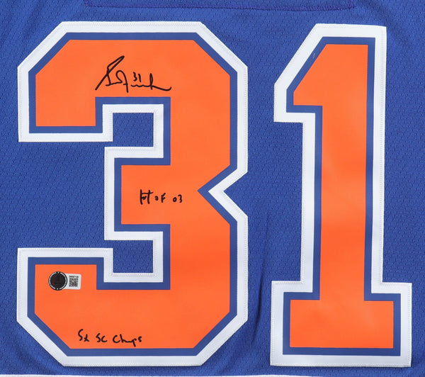 Mitchell & Ness jersey. Everything is sewn on, size adult Large. Hand-signed and twice inscribed in black felt-tip pen by Grant Fuhr (HOF). The autograph includes an official Beckett Authentication Services serially numbered scannable hologram & QR Code card for authenticity purposes. The signing of this item was witnessed by Beckett.Authentication: Beckett Scannable Hologram with QR Code card