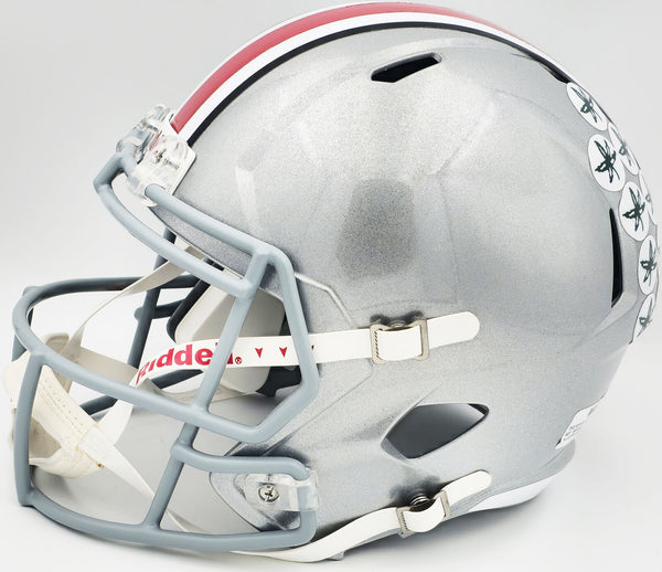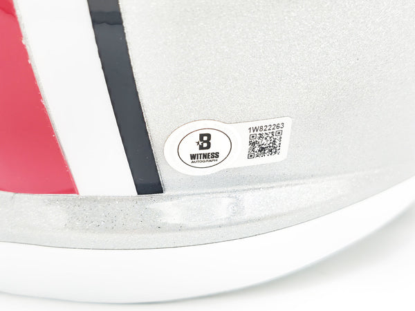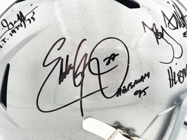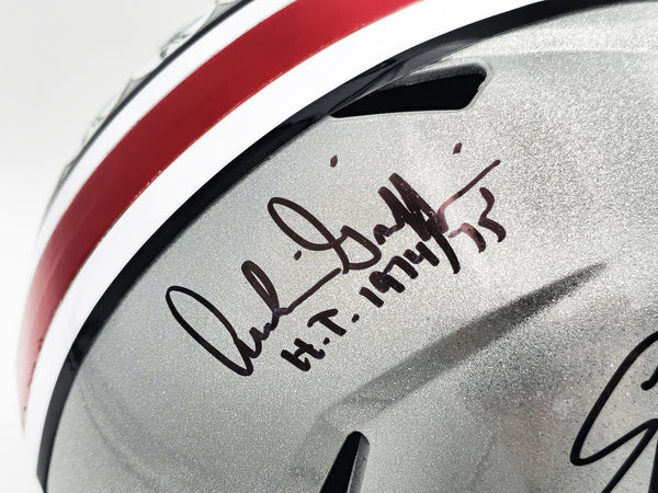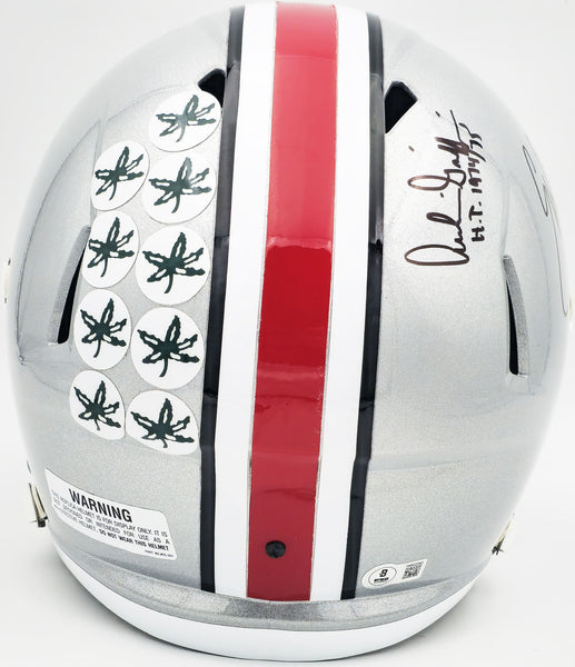 This is an Ohio State Buckeyes Silver Full Size Replica Speed Helmet that has been hand signed by Archie Griffin, Eddie George & Troy Smith. All 3 players inscribed Heisman as well as their respective Heisman year. This item has been witnessed and certified authentic by Beckett Authentication (BAS) and comes with their tamper-proof witness sticker.