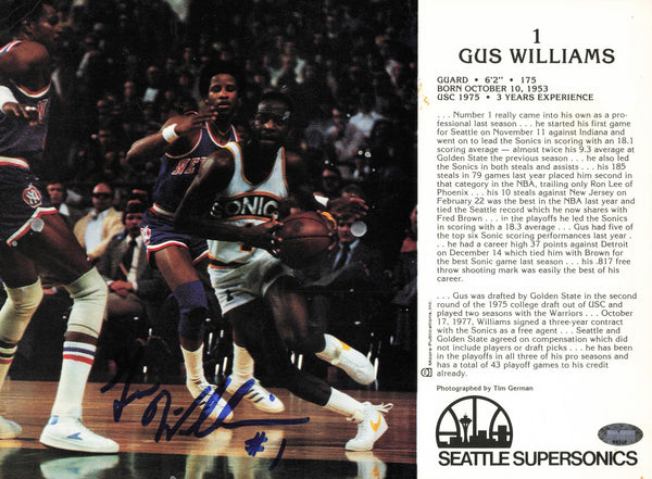 This is an 8x11 Photo that has been hand signed by Gus Williams. There are marks on the item as shown. This item was signed in the presence of a Mill Creek Sports representative and comes with their serial numbered hologram and matching certificate of authenticity.