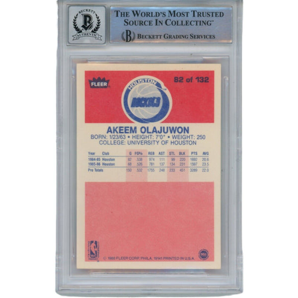 Hakeem Olajuwon Signed 1986 Fleer #82 Grade 10 Auto Beckett 42263 The number in the listing title is just an inventory sku for our records and is not the authentication number. Theses photos are of the exact item you will receive so see photos for condition. This is a slabbed 1986 Fleer #82 Trading Card with a grade 10 autograph that was personally autographed by Hakeem Olajuwon. Includes a certificate of authenticity from Beckett Authentication Services (BAS) and Denver Autographs.