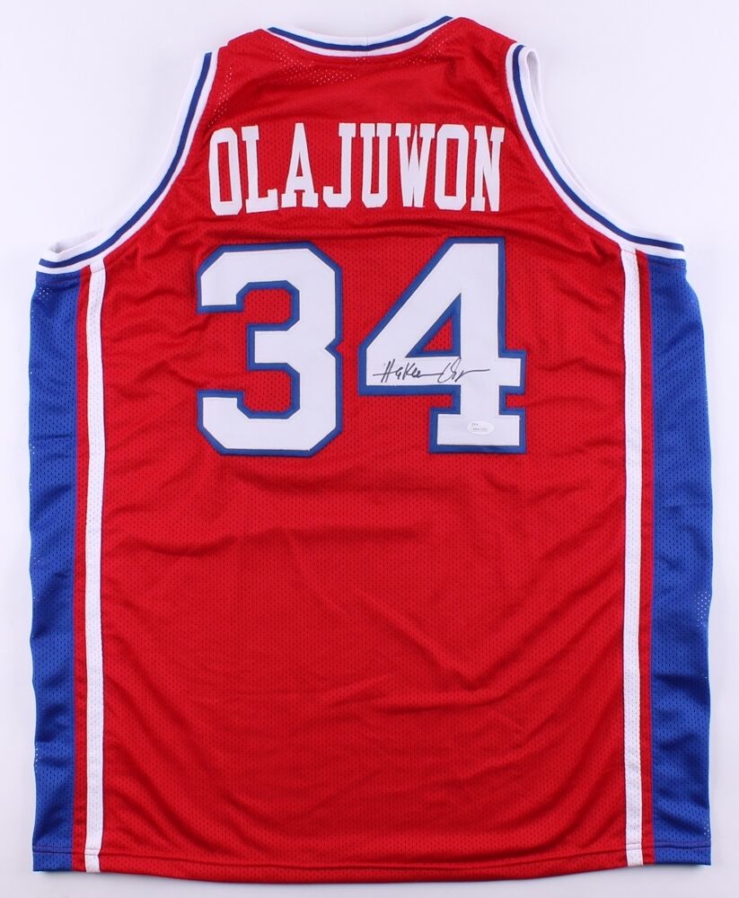 Custom on-court style jersey. Everything is sewn on, size XL. Hand-signed in black felt-tip pen by Hakeem Olajuwon (Rockets, HOF). The lot / autograph(s) includes an official James Spence Authentication (JSA) hologram and matching COA for authenticity purposes. The signing of this item was witnessed by JSA.Authentication: JSA COA