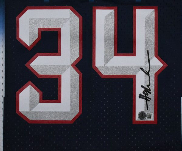 This is a Hand Autograph of Hakeem Olajuwon on a Houston Rockets Mitchell & Ness Blue Swingman Jersey. This item has a Beckett Witness Authentication, which comes with a Beckett numbered sticker hologram and a QR code for verification. You can view this item on the Beckett Authentication website and it shows when and where the item was signed. It was signed either at a public autograph appearance or a private signing. This is a stock photo of the item. Although you may not receive this exact item, the item you receive is virtually identical and brand new in great shape. This is a Hand Autograph of Hakeem Olajuwon on a Houston Rockets Mitchell & Ness Blue Swingman Jersey. This item has a Beckett Witness Authentication, which comes with a Beckett numbered sticker hologram and a QR code for verification. You can view this item on the Beckett Authentication website and it shows when and where the item was signed. It was signed either at a public autograph appearance or a private signing. This is a stock photo of the item. Although you may not receive this exact item, the item you receive is virtually identical and brand new in great shape.