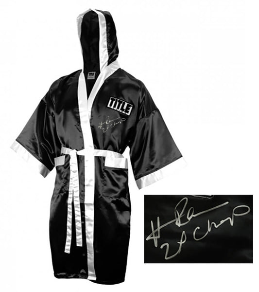Hasim Rahman signed Title black and white boxing robe with '2x Champ' inscription. Item comes with a Schwartz Sports Memorabilia tamper-proof numbered hologram and Certificate of Authenticity which can be verified online.
