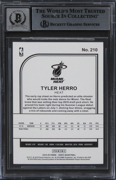 This Autographed Auto Graded Gem Mint 10! 2019 Hoops #210 Rookie Card has been Personally Signed by Tyler Herro of the Miami Heat . This item is 100% Authentic, it comes slabbed and authenticated by Beckett Authentication Services. The authenticity can be verified on Beckett Authentication Services website.