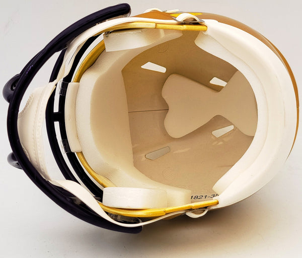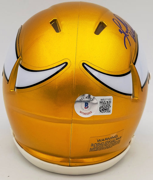 This is a Minnesota Vikings Flash Yellow Speed Mini Helmet that has been hand signed by Herschel Walker. The Flash helmets are very delicate and often have some marks or scratches on them. This item has been certified authentic by Beckett Authentication (BAS) and comes with their tamper-proof QR Code hologram.
