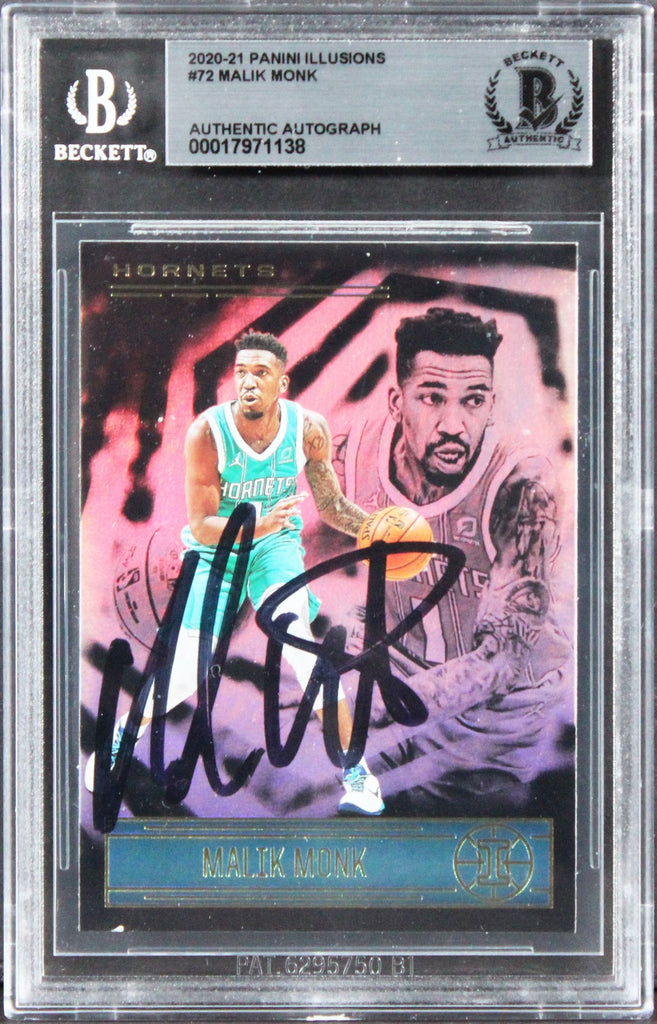 This Autographed 2020 Panini Illusions #72 Card has been Personally Signed by Malik Monk of the Charlotte Hornets. This item is 100% Authentic, it comes slabbed and authenticated by Beckett Authentication Services. We have multiples of this same item. While the photographs are representative of this item, the size, placement and strength of the signature may vary. Each item is hand signed, therefore, each autograph is unique.