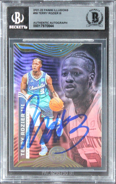 This Autographed 2021 Panini Illusions #59 Card has been Personally Signed by Terry Rozier III of the Charlotte Hornets. This item is 100% Authentic, it comes slabbed and authenticated by Beckett Authentication Services. The authenticity can be verified on Beckett Authentication Services website.