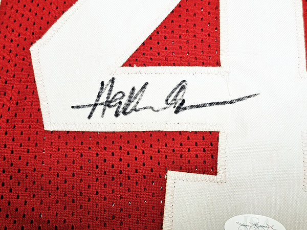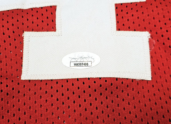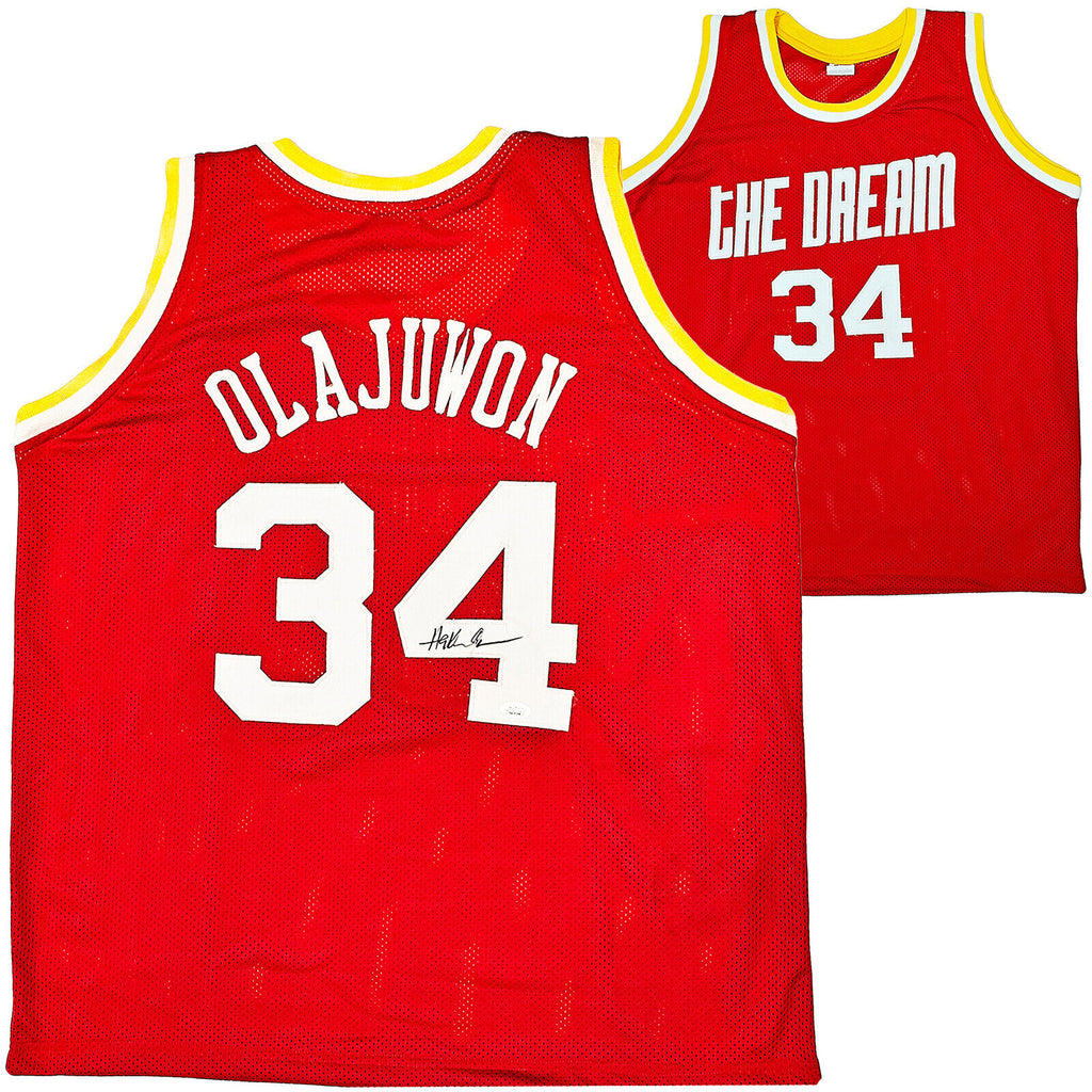This is a Red Jersey that has been hand signed by Hakeem Olajuwon. This is a custom jersey with no name brand. The approximate size is XL. It has nice sewn in name and numbers. This item has been certified authentic by JSA and comes with their tamper-proof sticker and matching certificate of authenticity.