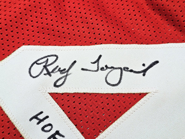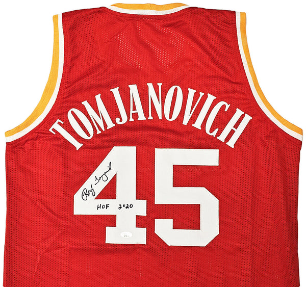 This is a Red Jersey that has been hand signed by Rudy Tomjanovich. This is a custom jersey with no name brand. The approximate size is XL. It has nice sewn in name and numbers. This item was inscribed "HOF 2020." This item has been certified authentic by JSA and comes with their tamper-proof sticker and matching certificate of authenticity.