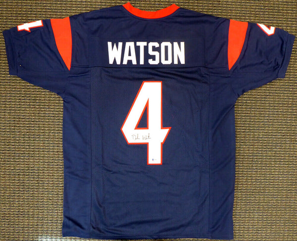 This is a Blue Jersey that has been hand signed by Deshaun Watson. This is a custom jersey with no name brand. The approximate size is XL. It has nice sewn in name and numbers. It was authenticated by Beckett Authentication Services (BAS) and comes with their tamper-proof sticker and matching serial numbered certificate of authenticity.