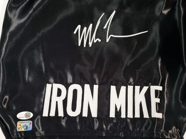 These autographed Iron Mike. "Baddest Man on the Planet" boxing trunks have been personally hand-signed by Mike Tyson.This autograph is certified by Beckett Authentication Services (BAS) Witness Certification. That means that a Beckett representative was present when this item was signed. It comes with the numbered authentication scannable hologram with a QR code card that verifies the authentication on the Beckett website.
