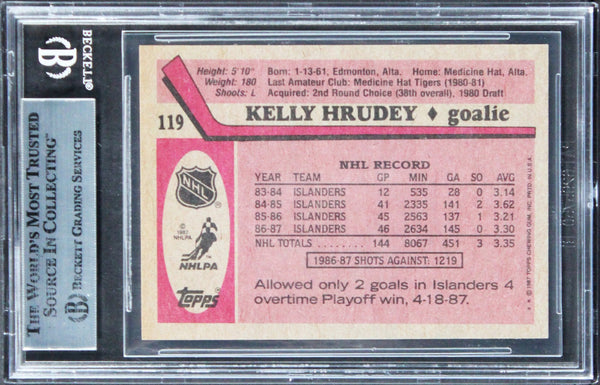 This Autographed 1987 Topps #119 Card has been Personally Signed by Kelly Hrudey of the New York Islanders. This item is 100% Authentic, it comes slabbed and authenticated by Beckett Authentication Services. The authenticity can be verified on Beckett Authentication Services website.