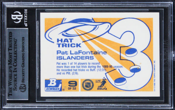 This Autographed 1990 Bowman Tiffany Hat Tricks #9 Card has been Personally Signed by Pat LaFontaine of the New York Islanders. This item is 100% Authentic, it comes slabbed and authenticated by Beckett Authentication Services. The authenticity can be verified on Beckett Authentication Services website.