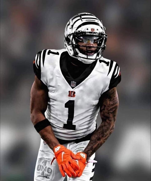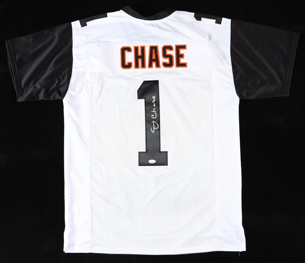Custom style jersey. Everything sewn on, size XL. Hand-signed by Ja'Marr Chase.The autograph(s) includes an official James Spence Authentication (JSA) "Signature Debut" hologram and COA. "Signature Debut" is the autographed memorabilia equivalent to a rookie card. The JSA definition of a "Signature Debut" is as follows: "Any item that is autographed and received by JSA prior to the last game of the signer's official rookie season.Authentication: JSA COA