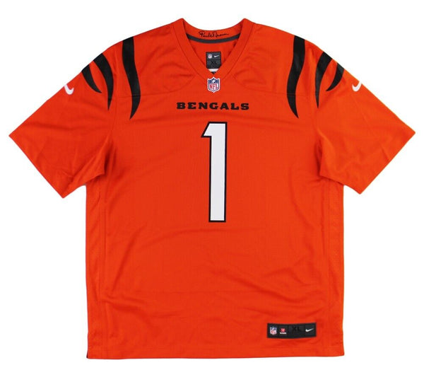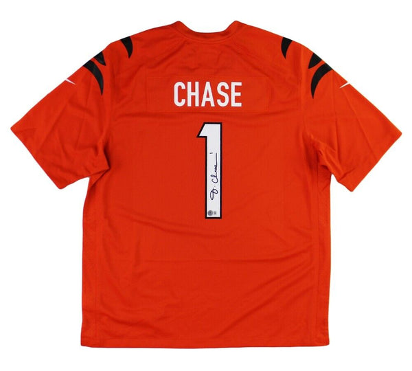 A Cincinnati Bengals Nike Game Orange NFL Jersey hand signed by Ja'Marr Chase. The item and signature are in excellent condition. Ja'Marr is a Football wide receiver. He was selected in the 1st round of the 2021 NFL Draft by the Cincinnati Bengals. He played college football at LSU. AUTHENTICATION: The item is accompanied by a Beckett Serial Numbered and Databased Hologram