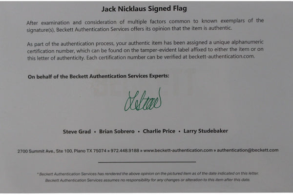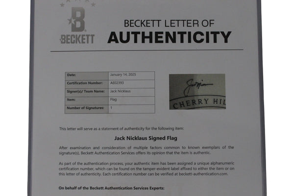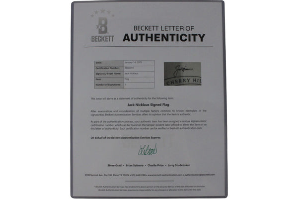 The number in the listing title is just an inventory sku for our records and is not the authentication number. The item pictured is the exact item you will receive, please see photos for condition. This is a PGA Cherry Hills 1993 Senior Open Flag that was personally autographed by Jack Nicklaus. Includes a certificate of authenticity from Beckett Authentication Services (BAS) and Denver Autographs. FREE SHIPPING within the USA on orders over $10!