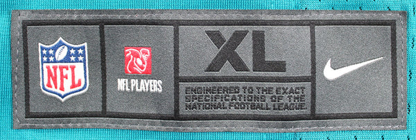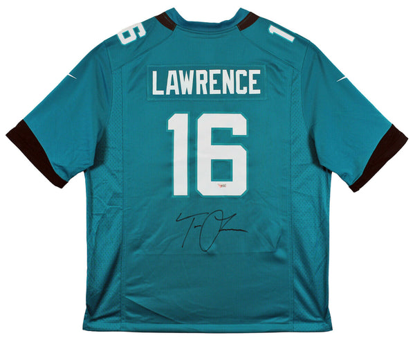 This Autographed Teal Nike Game Jersey has been Personally Signed by Trevor Lawrence of the Jacksonville Jaguars. This item is 100% Authentic to includes a numbered hologram by Fanatics. We conducted an autograph signing with Trevor Lawrence where multiples of the same item were signed. While the photographs are representative of this item, the size, placement and strength of the signature may vary. Each item is hand signed, therefore, each autograph is unique. This item can be verified through Fanatics. This is a X-Large sized Jersey.