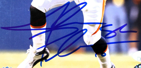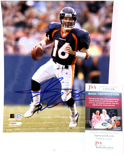 The product is an autographed 8x10 photo of football player Jake Plummer, who played for the Denver Broncos. The autograph is guaranteed to be authentic by James Spence Authentication (JSA). This original photo is a great collectible for fans of Jake Plummer or the Denver Broncos, showcasing a piece of memorabilia from the sport of football.