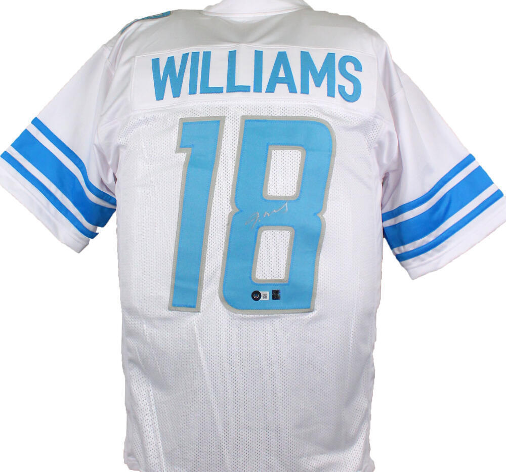 Jameson Williams Autographed White Pro Style Jersey #18- Beckett W Hologram *Silver THIS IS NOT AN NFL JERSEY. THIS HAS NO TAGS, NO LOGOS, NO EMBLEMS. This is a Jameson Williams of the Detroit Lions hand autographed custom made (non name brand) authentic style (stitched letters and numbers) jersey. This item has a Beckett Witnessed Authentication, which comes with a numbered hologram and a QR code for verification. You can view this item on the Beckett Authentication website and it shows when and where the item was signed. It was signed either at a public autograph appearance or a private signing. This is a stock photo of the item. Although you may not receive this exact item, the item you receive is virtually identical, brand new, and in great shape. Jersey size is XL.