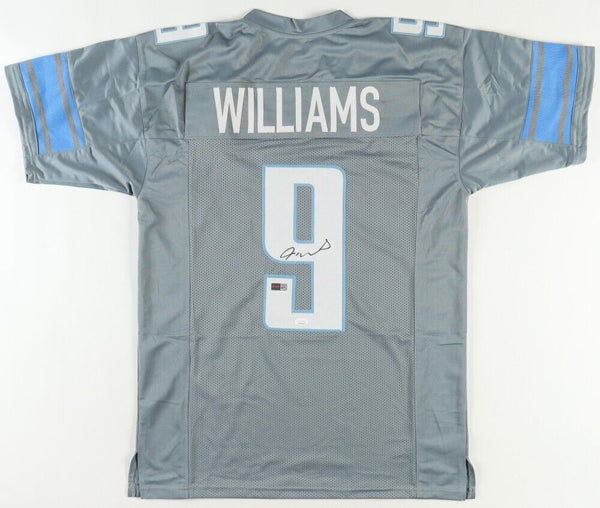 Custom On-field style jersey with everything sewn on, size adult XL. Hand-signed by Jameson Williams. The jersey has his 2023 regular season #9 on it.The autograph(s) includes an official James Spence Authentication (JSA) hologram and matching COA for authenticity purposes. The signing of this item was witnessed by JSA.Authentication: JSA COAThe lot / autograph(s) includes an official Players Ink Authentication hologram for authenticity purposes.Authentication: PIA Hologram