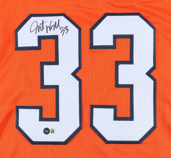 Custom on-field style jersey. Everything is sewn on, size XL. Hand-signed by Javonte Williams.The lot / autograph(s) includes an official Beckett Authentication Services serially-numbered hologram for authenticity purposes. The signing of this item was witnessed by Beckett.Authentication: Beckett Hologram