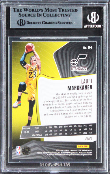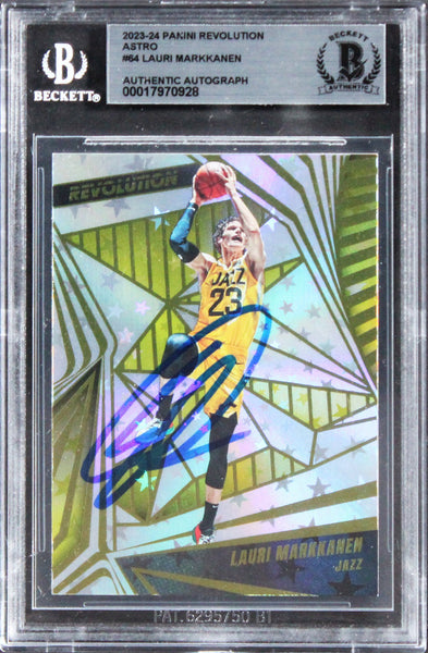 This Autographed 2023 Panini Revolution Astro #64 Card has been Personally Signed by Lauri Markkanen of the Utah Jazz. This item is 100% Authentic, it comes slabbed and authenticated by Beckett Authentication Services. The authenticity can be verified on Beckett Authentication Services website.