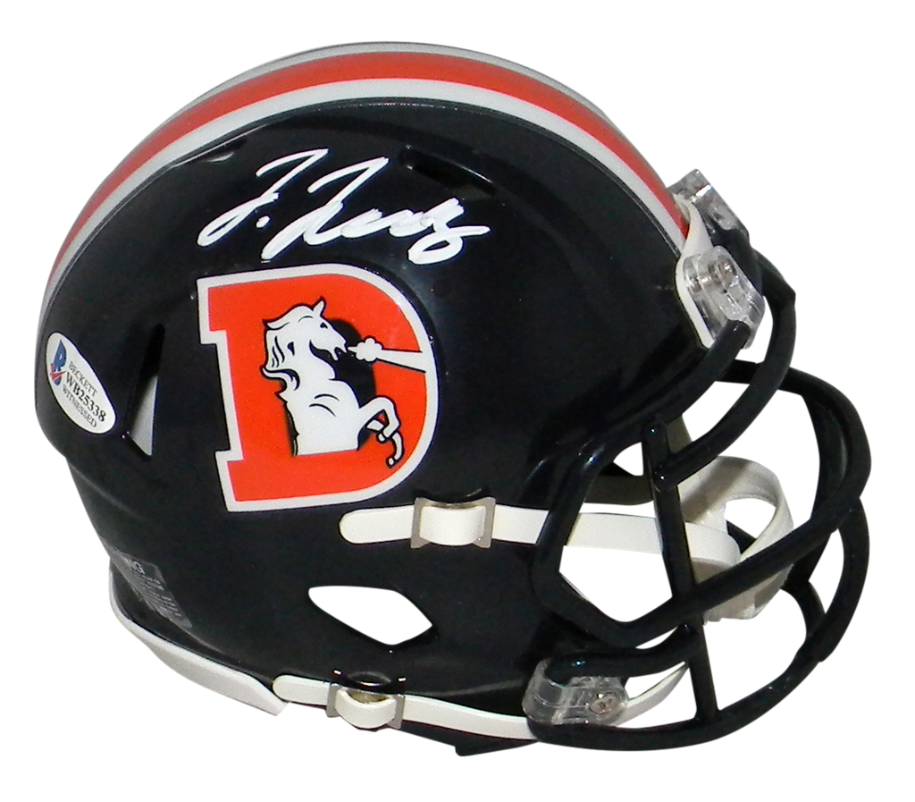 Jerry Jeudy, wide receiver for the Denver Broncos, has hand signed this Broncos Riddell Speed mini helmet at a private signing. This item is authenticated by Beckett Authentication Services and was signed in the presence of one of their representatives. Their tamper-evident hologram featuring a QR code and serial number is on the item. The authenticity can be verified online by entering the serial number or scanning the QR code.Item pictured may not be the exact item you will receive. It will be similar quality, and we guarantee your satisfaction.