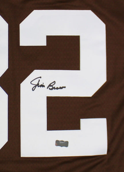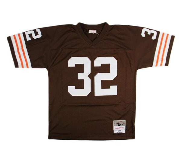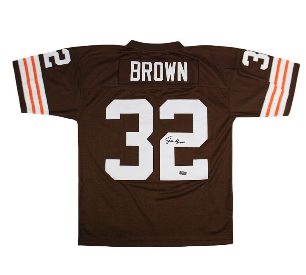 A Cleveland Browns Mitchell and Ness Brown Long Sleeve NFL Jersey hand signed by Jim Brown. The item and signature are in excellent condition. Jim is an 8x Pro Bowler, 4x NFL MVP and an NFL Champion. AUTHENTICATION: The item is accompanied by a Certificate of Authenticity - Serial Numbered and Databased Hologram - Picture of Jim from the signing