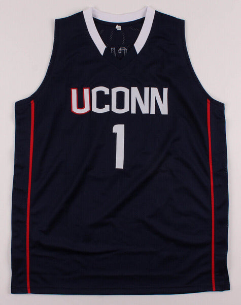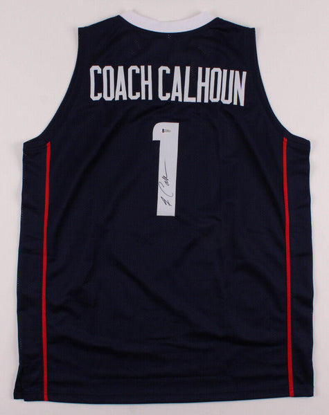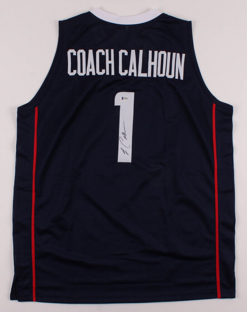 Custom on-field style jersey with everything sewn on, size XL. Jersey has been hand-signed in black felt-tip pen by Jim Calhoun. The lot / autograph(s) includes an official Beckett Authentication Services serially numbered hologram and matching COA for authenticity purposes.Authentication: Beckett COA