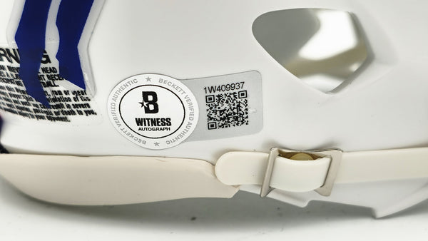This is a Buffalo Bills White Speed Mini Helmet that has been hand signed by Jim Kelly. This item has been witnessed and certified authentic by Beckett Authentication (BAS) and comes with their tamper-proof witness sticker.