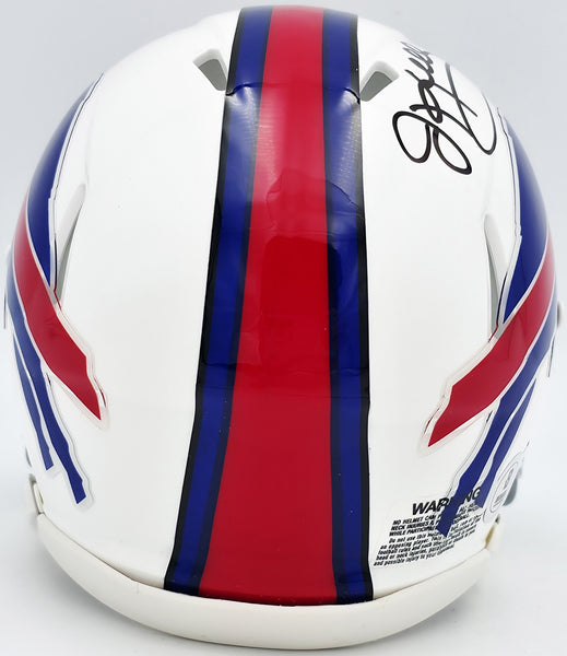 This is a Buffalo Bills 2011-20 Throwback White Speed Mini Helmet that has been hand signed by Jim Kelly. This item has been witnessed and certified authentic by Beckett Authentication (BAS) and comes with their tamper-proof witness hologram.