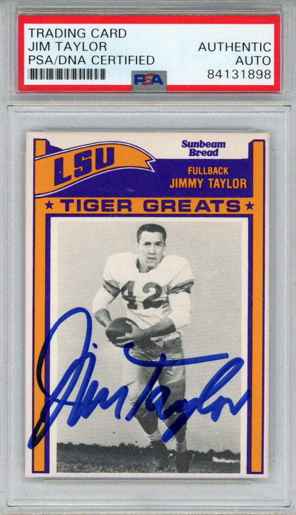 Jim Taylor Autographed/Signed 1983 Sunbeam #42 Trading Card PSA Slab 43741 The number in the listing title is just an inventory sku for our records and is not the authentication number. This is the exact item that you will receive so please see pictures for condition. This is a trading card that was personally autographed by Jim Taylor. This has been professionally slabbed by Professional Authentication Services (PSA) and includes a certificate of authenticity from Denver Autographs.