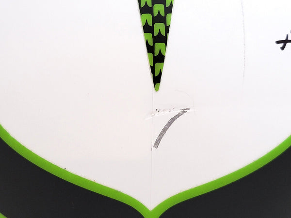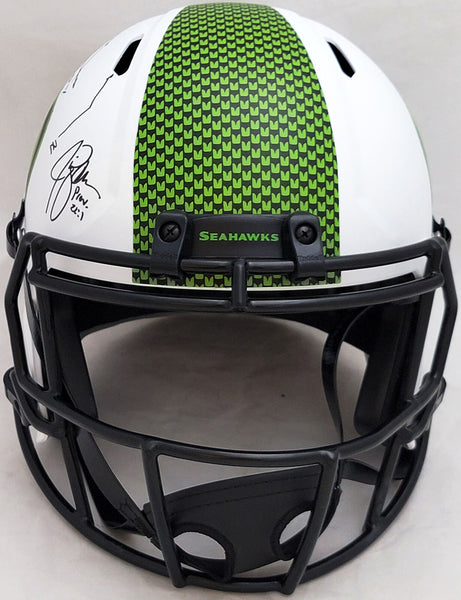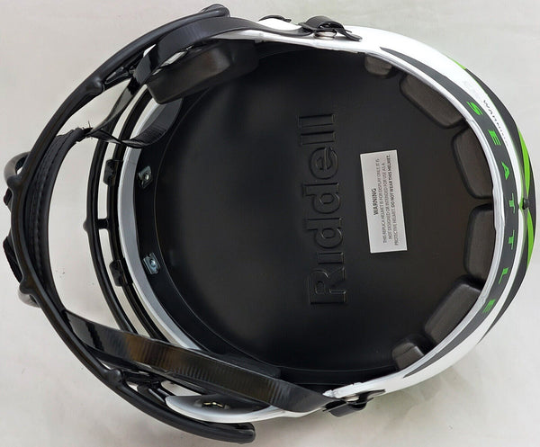This is a Seattle Seahawks Lunar Eclipse White Full Size Speed Replica Helmet that has been hand signed by Jim Zorn. Jim Zorn inscribed this item with one of his favorite plays that the Seahawks used in games. There is a chip on the back of the helmet as shown. This item was signed in the presence of a Mill Creek Sports representative and comes with their serial numbered hologram and matching certificate of authenticity.