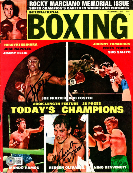 This is an International Boxing magazine that has been hand signed by Joe Frazier & Ruben Olivares. This item has been certified authentic by Beckett Authentication (BAS) and comes with their tamper-proof hologram and matching full-page certificate of authenticity.