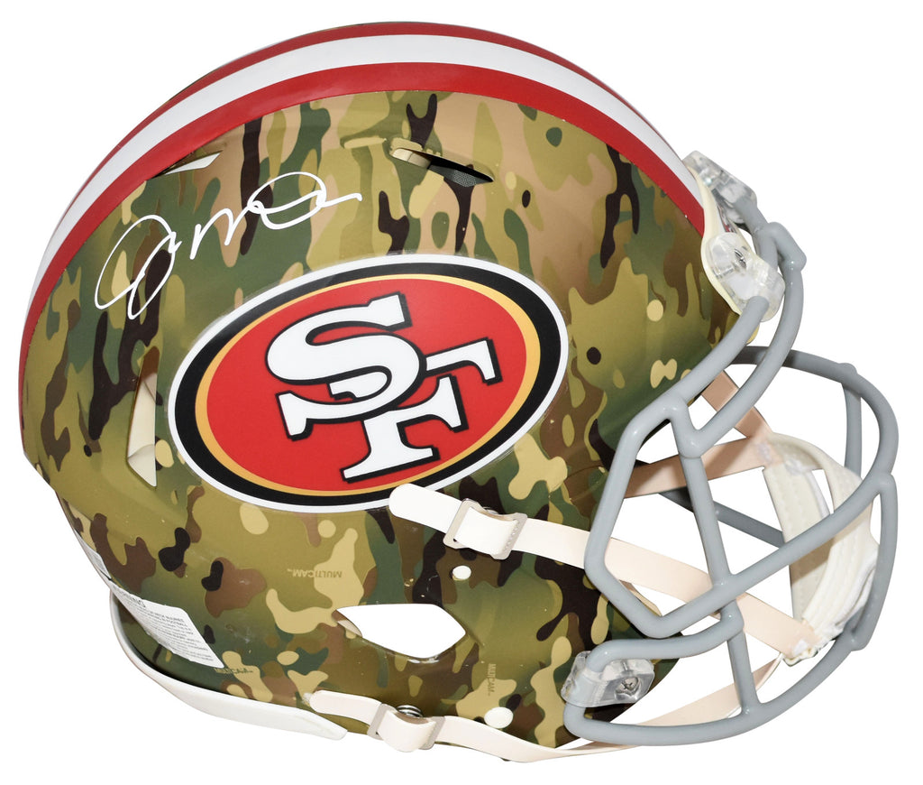 Joe Montana, former Hall of Fame quarterback for the San Francisco 49ers, has hand signed this San Francisco 49ers Riddell Speed Camo full-size authentic helmet at a private signing. This helmet is fully padded inside like the ones worn on the field. This item is authenticated by Beckett Authentication Services, one of the leaders in the industry. Their tamper-evident hologram featuring a QR code and serial number is on the item. The authenticity can be verified online by entering the serial number or scanning the QR code.Item pictured may not be the exact item you will receive. It will be similar quality, and we guarantee your satisfaction.