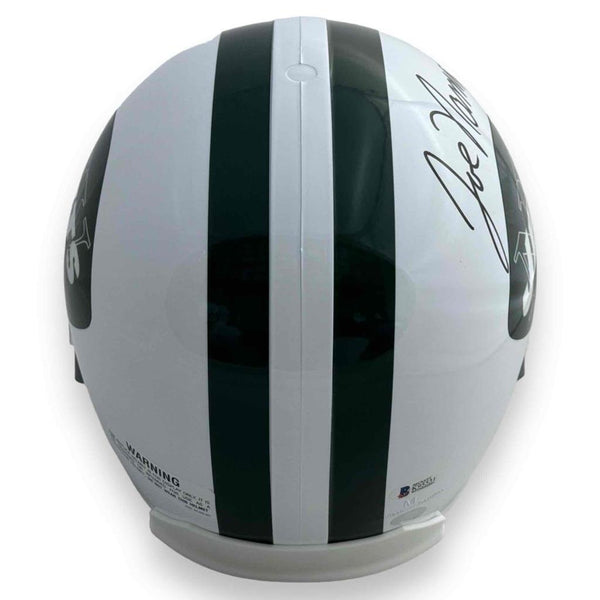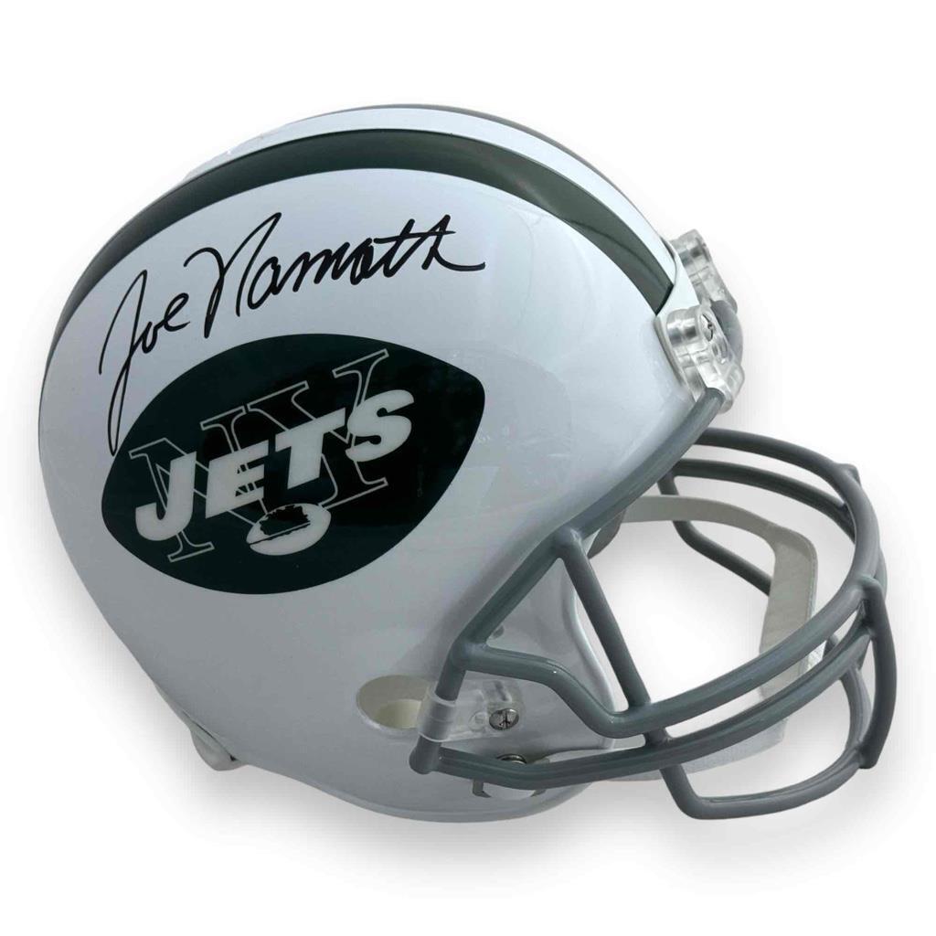 This signed item is brand new in box. This item will make a great gift or a great addition to any collection at an AFFORDABLE PRICE! ATHLETE: Joe Namath ITEM: New York Jets Full Size Replica Helmet AUTHENTICATION: This item comes with a Beckett Authentication serial #'ed hologram affixed to the item. To ensure authenticity, the hologram can be reviewed online. This process helps to ensure that the product purchased is authentic and eliminates any possibility of duplication or fraud. This item was signed in the presence of a Beckett representative.