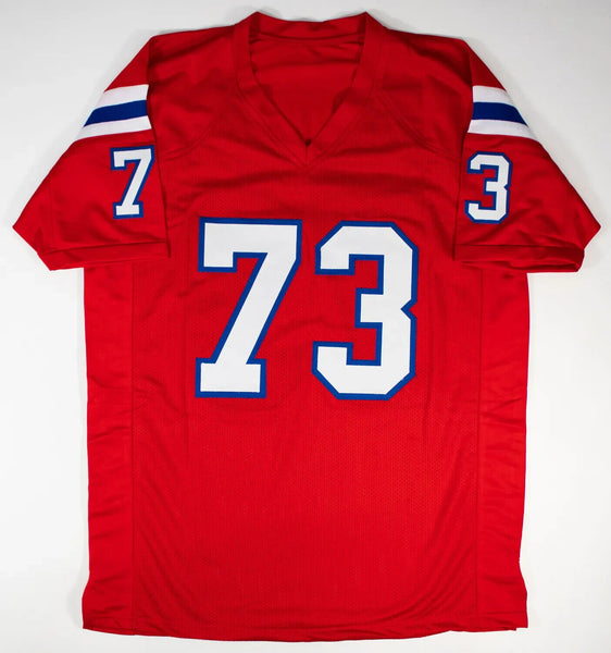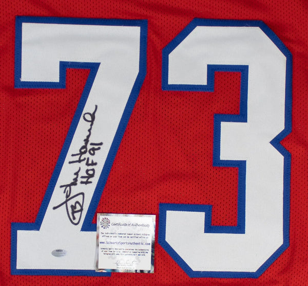 Custom on-field style jersey. Everything sewn on, size XL. Hand-signed and inscribed in black felt tip pen by John Hannah of the New England Patriots. When signing, Hannah inscribed "HOF 91" along with his signature. This autograph is certified by Schwartz Sports. It comes with the numbered hologram and Certificate of Authenticity.Custom on-field style jerseys are a more affordable option for autograph seekers. These jerseys do not have any brand name or tags and are made in the Philippines. They feature stitched on names and numbers and are made to look very similar to the on-field jerseys that the players wear. These custom jerseys are very commonly used in the memorabilia industry.