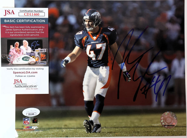 The product is an 8x10 photo of John Lynch, a former player for the Denver Broncos in football. This photo is autographed by John Lynch and comes with authentication from James Spence Authentication (JSA). As an original autographed piece, it is a valuable collectible for fans of the Denver Broncos and football memorabilia enthusiasts alike.