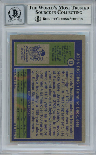 John Riggins Autographed 1972 Topps #13 Rookie Card HOF Beckett Slab 35019 The number in the listing title is just an inventory sku for our records and is not the authentication number. The item pictured is a stock photo unless otherwise noted. This is a 1972 Topps #13 rookie trading card that was personally autographed by John Riggins. This has been professionally slabbed by Beckett Authentication Services (BAS) and includes a certificate of authenticity from Denver Autographs.