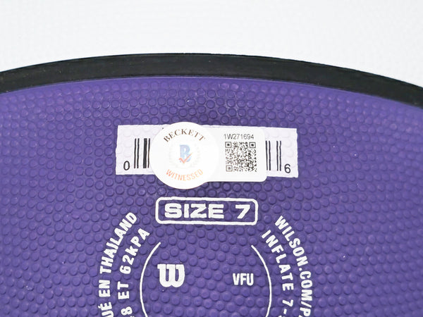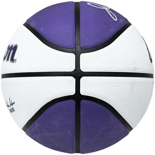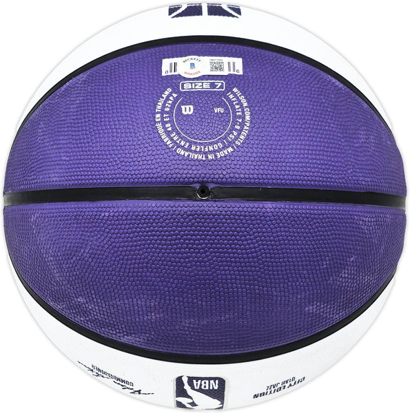 This is a Purple & White City Edition Basketball that has been hand signed by John Stockton. This item has been witnessed and certified authentic by Beckett Authentication (BAS) and comes with their tamper-proof witness sticker.
