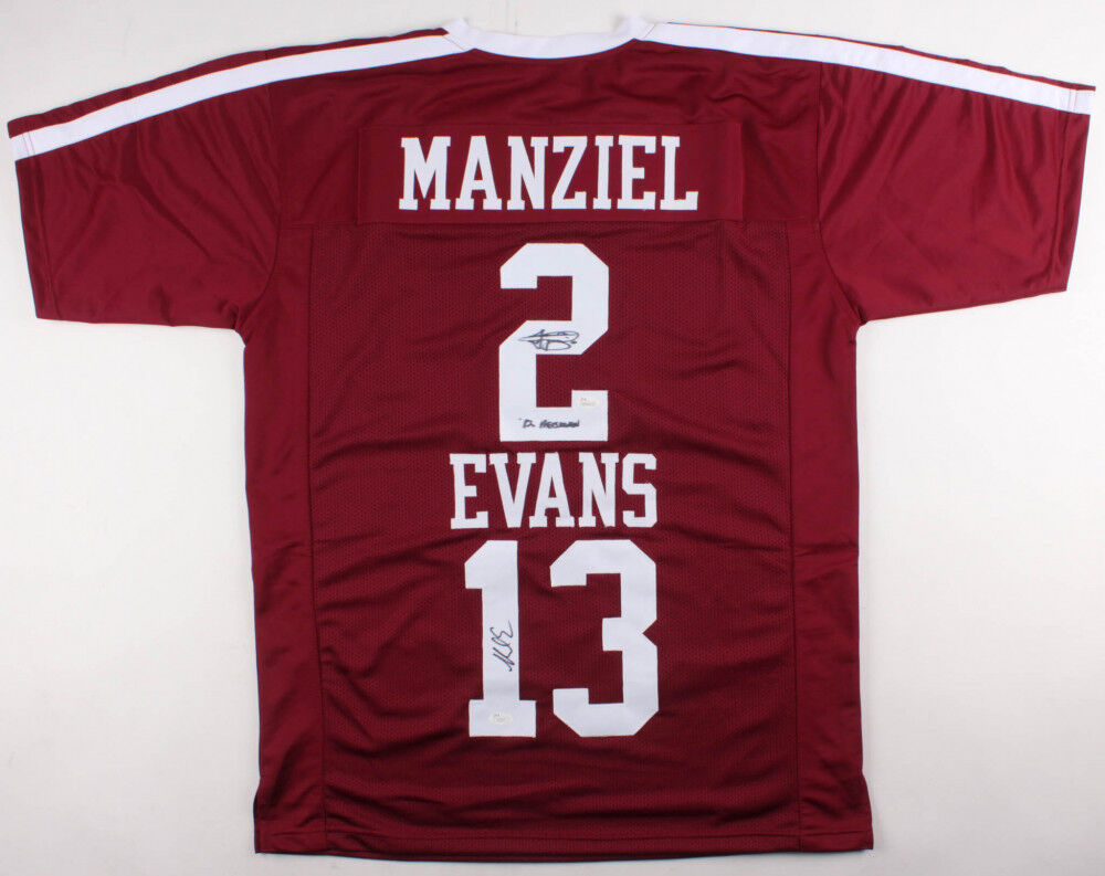 Custom on-field style jersey has everything sewn on, size XL. Hand-signed in black felt-tip pen by Johnny Manziel and Mike Evans (Bucccaners). The autograph includes an official James Spence Authentication (JSA) hologram and matching COA for authenticity purposes. The signing of this item was witnessed by JSA.Authentication: JSA COA