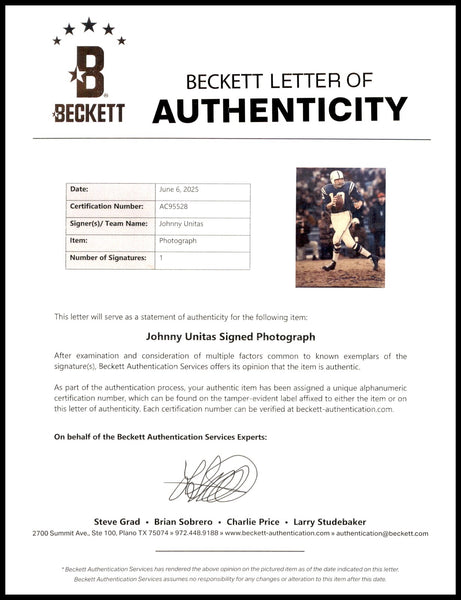 This is an 8x10 Photo that has been hand signed by Johnny Unitas. This item has been certified authentic by Beckett Authentication (BAS) and comes with their tamper-proof hologram and matching full-page certificate of authenticity.