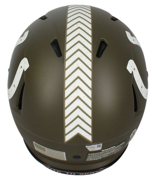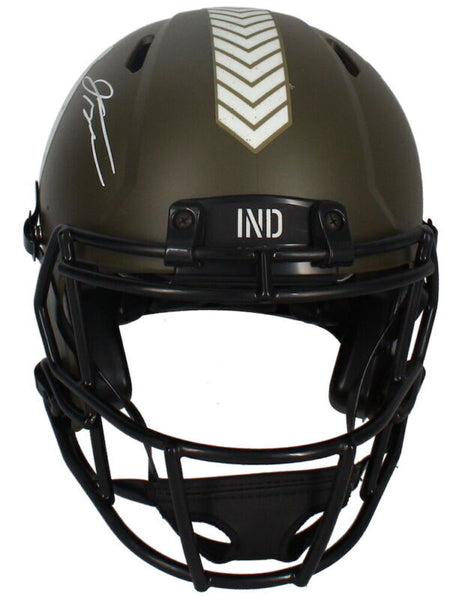 This indianapolis colts salute to service authentic speed helmet has been personally hand-signed by jonathan taylor. it is officially licensed by the national football league and comes with an individually numbered, tamper-evident hologram from fanatics authentic. to ensure authenticity, the hologram can be reviewed online. this process helps to ensure that the product purchased is authentic and eliminates any possibility of duplication or fraud.the autograph includes an official fanatics hologram and matching coa for authenticity purposes.comes with a tamper-evident hologram from fanatics authenticatedofficially licensed by the nfl money back guarantee! if for any reason you are not completely satisfied with the quality or authenticity of your purchase, we will gladly give you a full refund or exchange, whichever you prefer up to 30 days after purchase. please feel free to e-mail us with any questions. good luck bidding!!! authenticator pre-certified authenticator: fanatics authenticated history of item: jonathan taylor has signed this item in the presence of a representative from fanatics. describe how you came to possess this item: super sports center is a fully authorized dealer for upper deck authenticated as well as mounted memories and steiner sports. other information about you and / or the item: super sports center strives to deliver the most authentic in sports memorabilia from trusted companies like mounted memories, steiner sports and upper deck authenticated. if it exists, we can find it for you!