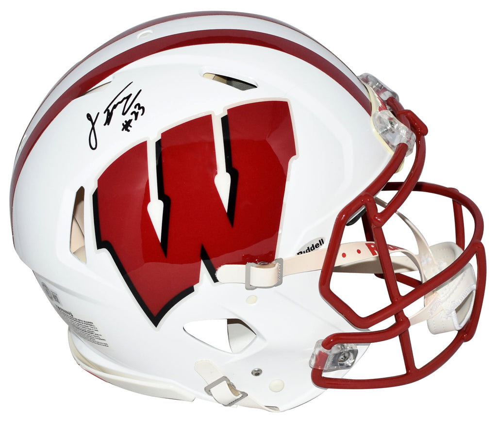 Jonathan Taylor, former All-American running back for the Badgers, has hand signed this Wisconsin Riddell Speed full-size authentic helmet at a private signing. This helmet is fully padded inside like the ones worn on the field. This item is authenticated by Beckett Authentication Services, one of the top authenticators in the industry. Their tamper-evident hologram featuring a QR code and serial number is on the item. The authenticity can be verified online by entering the serial number or scanning the QR code.Item pictured may not be the exact item you will receive. It will be similar quality, and we guarantee your satisfaction.