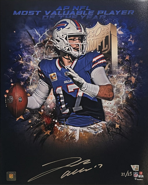 Josh Allen Autographed Buffalo Bills 16" x 20" MVP Photo Collage Fanatics LE 25This 16" x 20" photograph has been personally hand-signed by Josh Allen. It is officially licensed by the National Football League and comes with an individually numbered, tamper-evident hologram from Fanatics Authentic. To ensure authenticity, the hologram can be reviewed online. This process helps to ensure that the product purchased is authentic and eliminates any possibility of duplication or fraud.The autograph includes an official Fanatics hologram and matching COA for authenticity purposes.Comes with a tamper-evident hologram from Fanatics AuthenticatedOfficially licensed by the NFL MONEY BACK GUARANTEE! If for any reason you are not completely satisfied with the quality or authenticity of your purchase, we will gladly give you a full refund or exchange, whichever you prefer up to 30 days after purchase. Please feel free to e-mail us with any questions. Thank you. Authenticator Pre-Certified Authenticator: Fanatics Authenticated History of item: Josh Allen has signed this item in the presence of a representative from Fanatics. Describe how you came to possess this item: Super Sports Center is a fully authorized dealer for Upper Deck Authenticated as well as Mounted Memories and Steiner Sports. Other information about you and / or the item: Super Sports Center strives to deliver the most authentic in sports memorabilia from trusted companies like Mounted Memories, Steiner Sports and Upper Deck Authenticated. If it exists, we can find it for you!