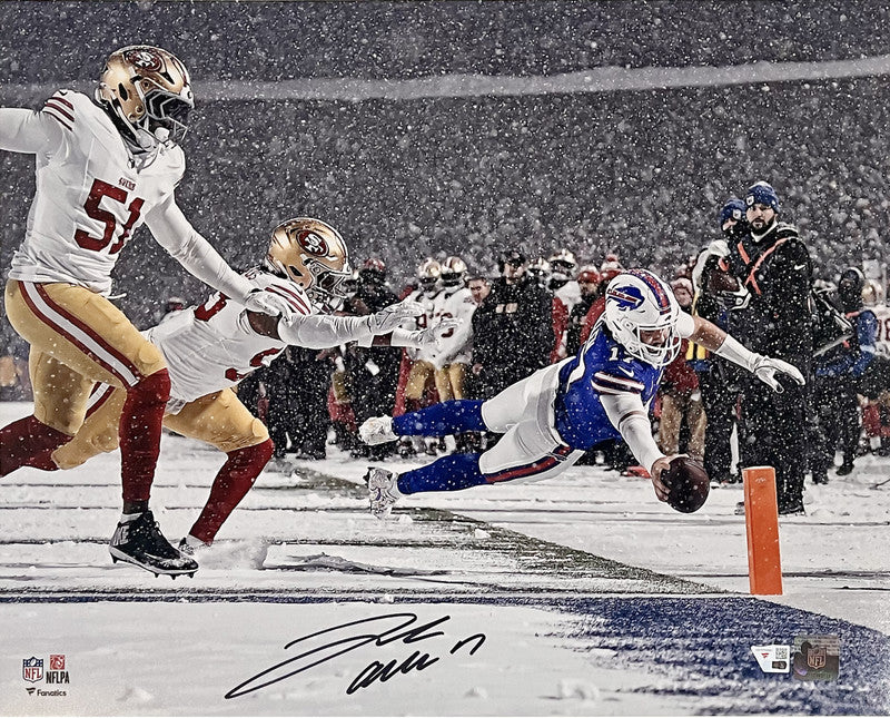 Josh Allen Autographed Buffalo Bills Diving Touchdown in the Snow 16" x 20" Photograph FanaticsThis 16" x 20" photograph has been personally hand-signed by Josh Allen. It is officially licensed by the National Football League and comes with an individually numbered, tamper-evident hologram from Fanatics Authentic. To ensure authenticity, the hologram can be reviewed online. This process helps to ensure that the product purchased is authentic and eliminates any possibility of duplication or fraud.The autograph includes an official Fanatics hologram and matching COA for authenticity purposes.Comes with a tamper-evident hologram from Fanatics AuthenticatedOfficially licensed by the NFL MONEY BACK GUARANTEE! If for any reason you are not completely satisfied with the quality or authenticity of your purchase, we will gladly give you a full refund or exchange, whichever you prefer up to 30 days after purchase. Please feel free to e-mail us with any questions. Thank you. Authenticator Pre-Certified Authenticator: Fanatics Authenticated History of item: Josh Allen has signed this item in the presence of a representative from Fanatics. Describe how you came to possess this item: Super Sports Center is a fully authorized dealer for Upper Deck Authenticated as well as Mounted Memories and Steiner Sports. Other information about you and / or the item: Super Sports Center strives to deliver the most authentic in sports memorabilia from trusted companies like Mounted Memories, Steiner Sports and Upper Deck Authenticated. If it exists, we can find it for you!