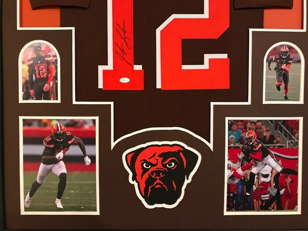 This autographed jersey has been personally hand-signed by Josh Gordon of the Cleveland Browns. This autograph is certified by James Spence Authentication's (JSA) Witnessed Protection Program. That means that a JSA representative was present when this item was signed. It comes with the numbered hologram and matching Certificate of Authenticity. This jersey is professionally framed. It measures 32"x 40" inside and 34"x 42" outside, using UV protective acrylic glass for safe keeping and safe transport, team color matting, black moulding and hanging hooks on the back. 100% ready to hang.