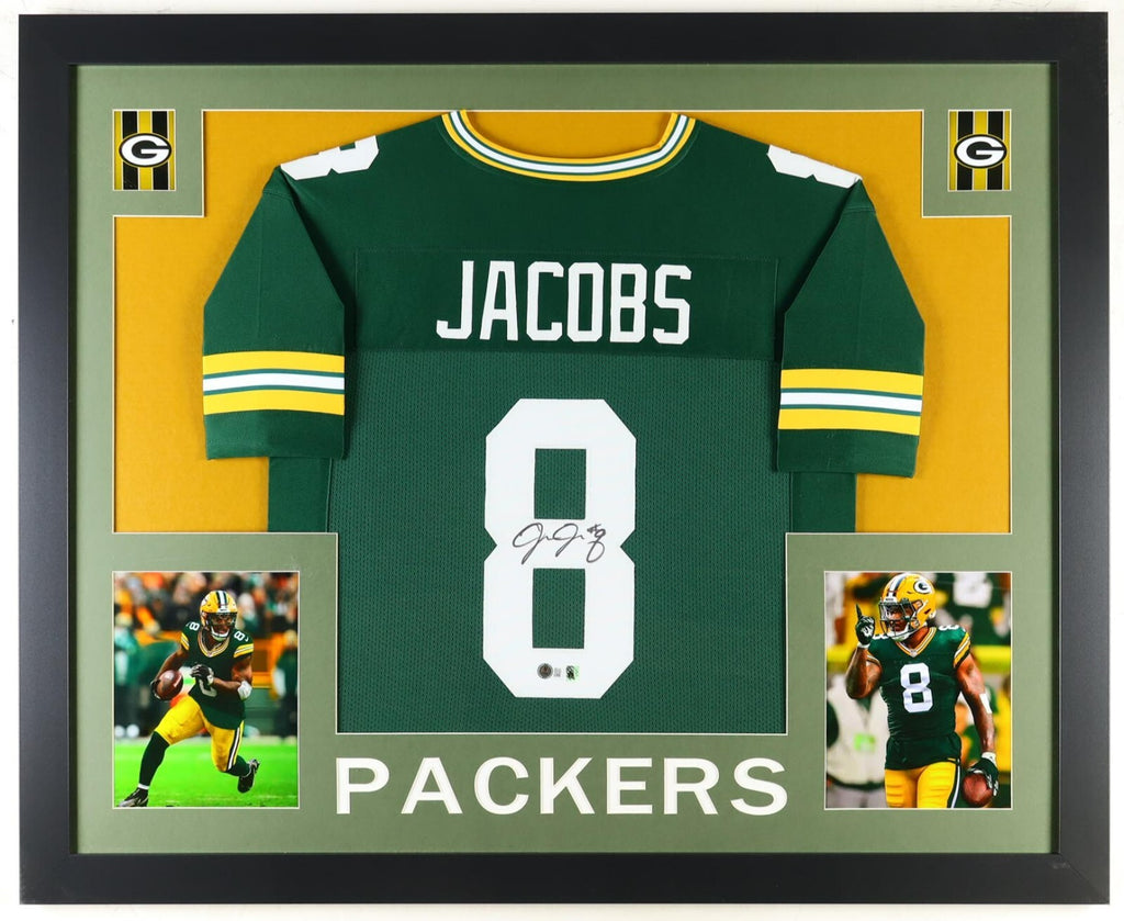 Custom frame measures approximately 35" x 43" in size and features a jersey hand-signed by Josh Jacobs.The lot / autograph(s) includes an official Beckett Authentication Services serially numbered hologram and QR Code card for authenticity purposes. The signing of this item was witnessed by Beckett.Authentication: Beckett Hologram with QR Code card