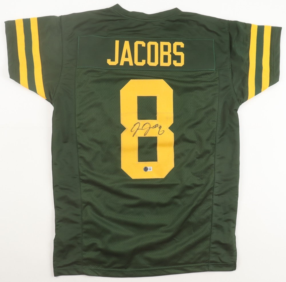 Custom on-field style jersey. Everything sewn on, size XL. Hand-signed by Josh Jacobs (Green Bay Packers).The autograph includes an official Beckett Authentication Services serially numbered hologram as well as an official Josh Jacobs player hologram and COA for authenticity purposes. The signing of this item was witnessed by Beckett.Authentication: Beckett Hologram & Jacobs COA