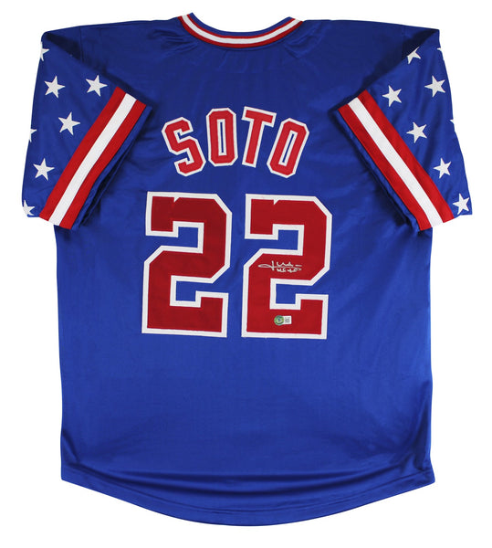 This Autographed Blue USA Pro Style Jersey has been Personally Signed by Juan Soto of the New York Mets. This item is 100% Authentic to include a hologram by Beckett Authentication Services. This item will come with an affixed Beckett Authentication Services (BAS) authentication sticker, which includes a scannable QR code to verify authenticity. Please note that Beckett no longer provides serial-numbered COA cards, and the attached BAS sticker will serve as the complete authentication for this item. We have multiples of this same item. While the photographs are representative of this item, the size, placement and strength of the signature may vary. Each item is hand signed, therefore, each autograph is unique. This is a X-Large sized, non-branded, custom-stitched Jersey.